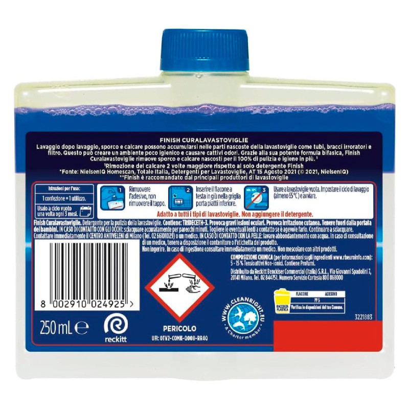 Finish Curalavastoviglie favorisce la manutenzione della lavastoviglie. Neutralizza la presenza di cattivi odori, rimuove il calcare e pulisce le parti più nascoste come tubi, bracci irroratori e filtro. Adatto a tutti i tipi di lavastoviglie. FORMULA MODALITÀ D’USO FORMATO
