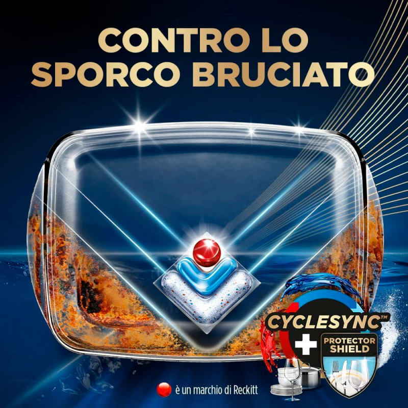 Detersivo in pastiglie per lavastoviglie con fragranza fresca e con scudo protettivo contro lo sporco e residui incrostati. Formula in grado di rimuovere le macchie di bruciato anche senza prelavaggio, agendo con azioni differenti lungo l’intero ciclo di lavaggio. Per stoviglie sempre pulite e brillanti lavaggio dopo lavaggio. Confezione da 48 Tabs.