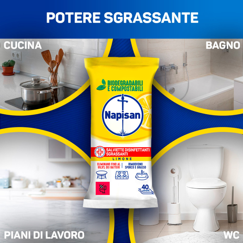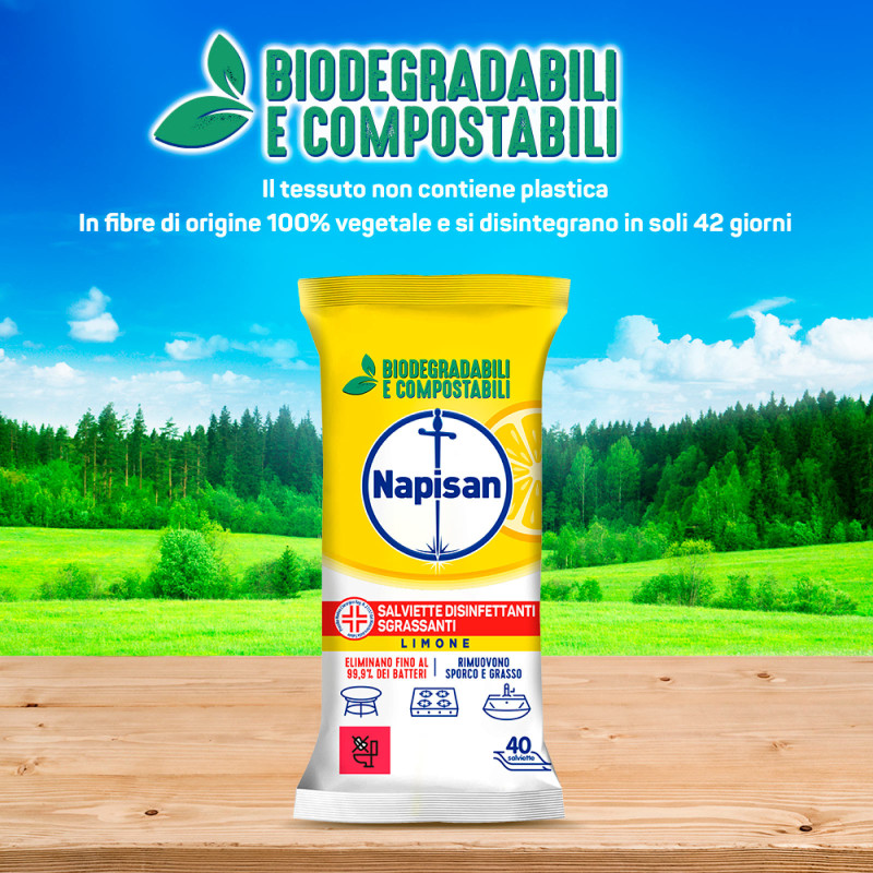 Napisan Salviette Disinfettanti Sgrassanti al Limone Biodegradabili e Compostabili eliminano fino al 99,9% dei batteri in meno di un minuto e rimuovono sporco, grasso e residui di cibo bruciato. Multisuperifici e ideali per superfici dure, possono essere utilizzate per la pulizia di cucina, bagno, seggioloni e giocattoli, wc e box doccia e dispositivi elettronici. Adatto alla disinfezione delle superfici ospedaliere. FORMULA MODALITÀ D’USO AVVERTENZE FORMATO |